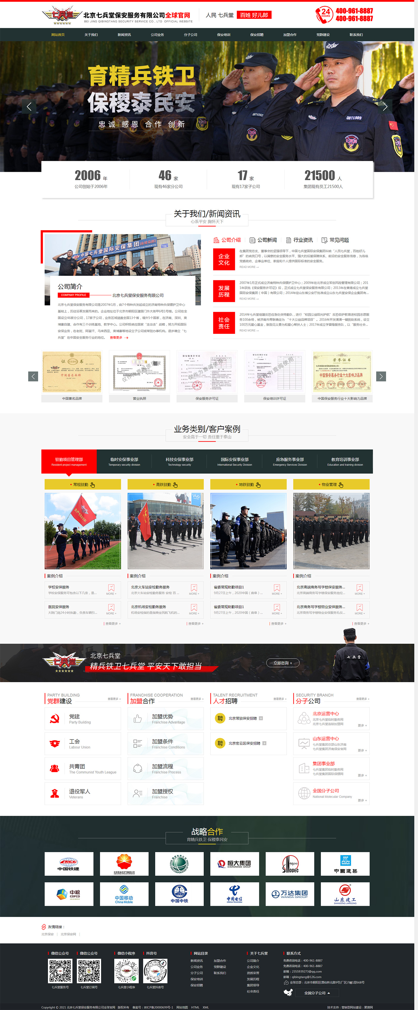 北京七兵堂保安服務(wù)有限公司是2007年1月,由7個特種兵發(fā)起成立的濟南特種兵保鏢護衛(wèi)中心基礎(chǔ)上,歷經(jīng)沿革發(fā)展而來的。企業(yè)地址位于北京市朝陽區(qū)建國門外大街甲6號1號樓。公司在全國設(shè)立46家分公司,17家子公司,業(yè)務(wù)區(qū)域涵蓋全國13個省,境外5個國家,在濟南、深圳、柬埔寨自建、合作有三個訓練基地、教學中心。公司積極響應(yīng)國家“走出去”戰(zhàn)略,努力開拓國際安保業(yè)務(wù),在老撾、阿富汗、馬來西亞、柬埔寨等地設(shè)立子公司或常駐辦事機構(gòu)。逐步確立“七兵堂”在中國安全服務(wù)行業(yè)的地位。